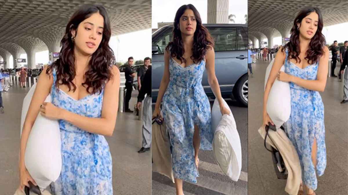 जाह्नवी कपूर एयरपोर्ट पर फ्लोरल ब्लू फ्रॉक ड्रेस में पहुंची थीं. इस दौरान उन्होंने एक हाथ में ब्लैक हैंडबैग और एक हाथ में व्हाइट तकिया लिया हुआ था. इस दौरान कार से उतरते ही जाह्नवी पैपराजी को पोज देते हुए जाती नजर आ रही हैं.